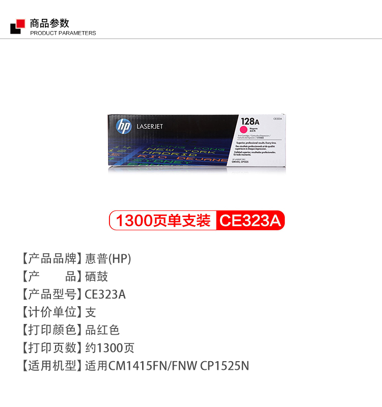 | 名称 | 惠普 CE323A 128A 硒鼓 品红色 适用CM1415fn/fnw/CP1525n单位:个 |