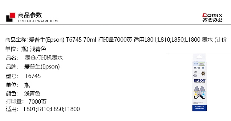 | 名称 | 爱普生 T6745 墨水 淡青 适用L801/L810/L850/L805/L1800 单位:个 |